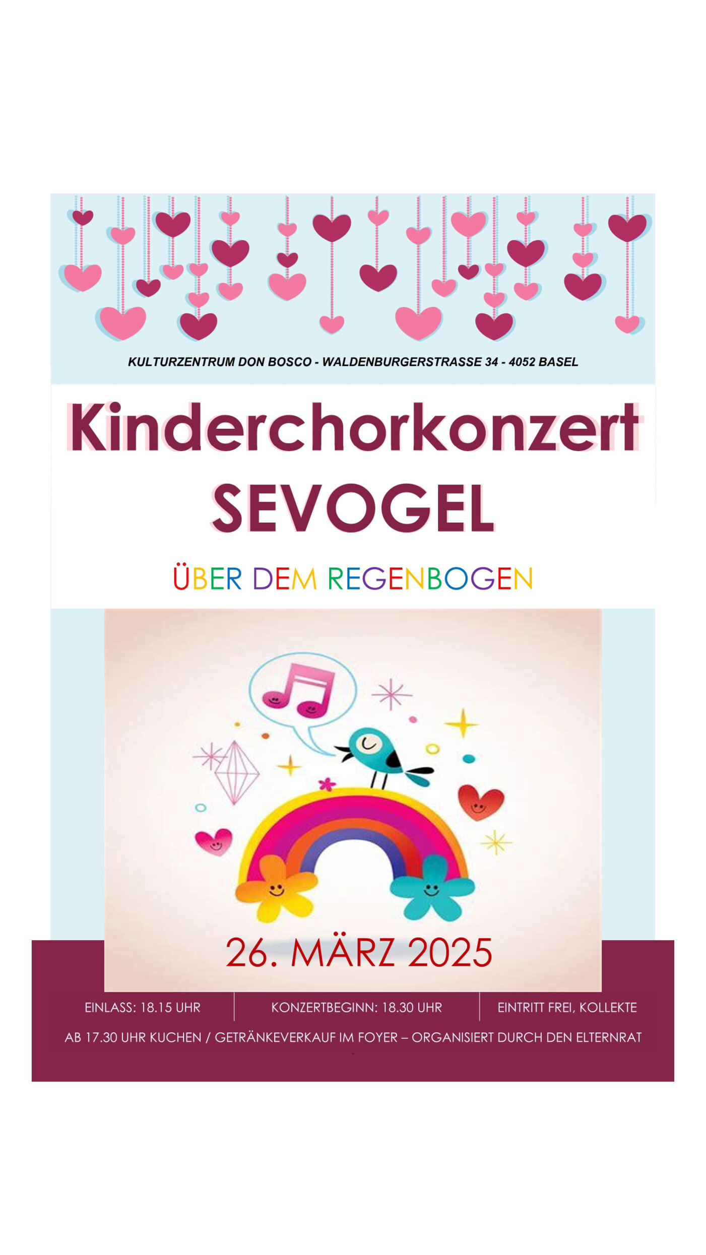 Alle VeranstaltungenMärz 2025Mi 18:30 26 Kinderchor Sevogel Über dem Regenbogen Paul Sacher Saal Eintritt frei, Kollekte Einlass: 18:15Konzert: 18:30 alle Veranstaltungen
