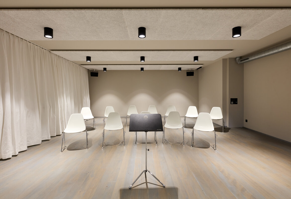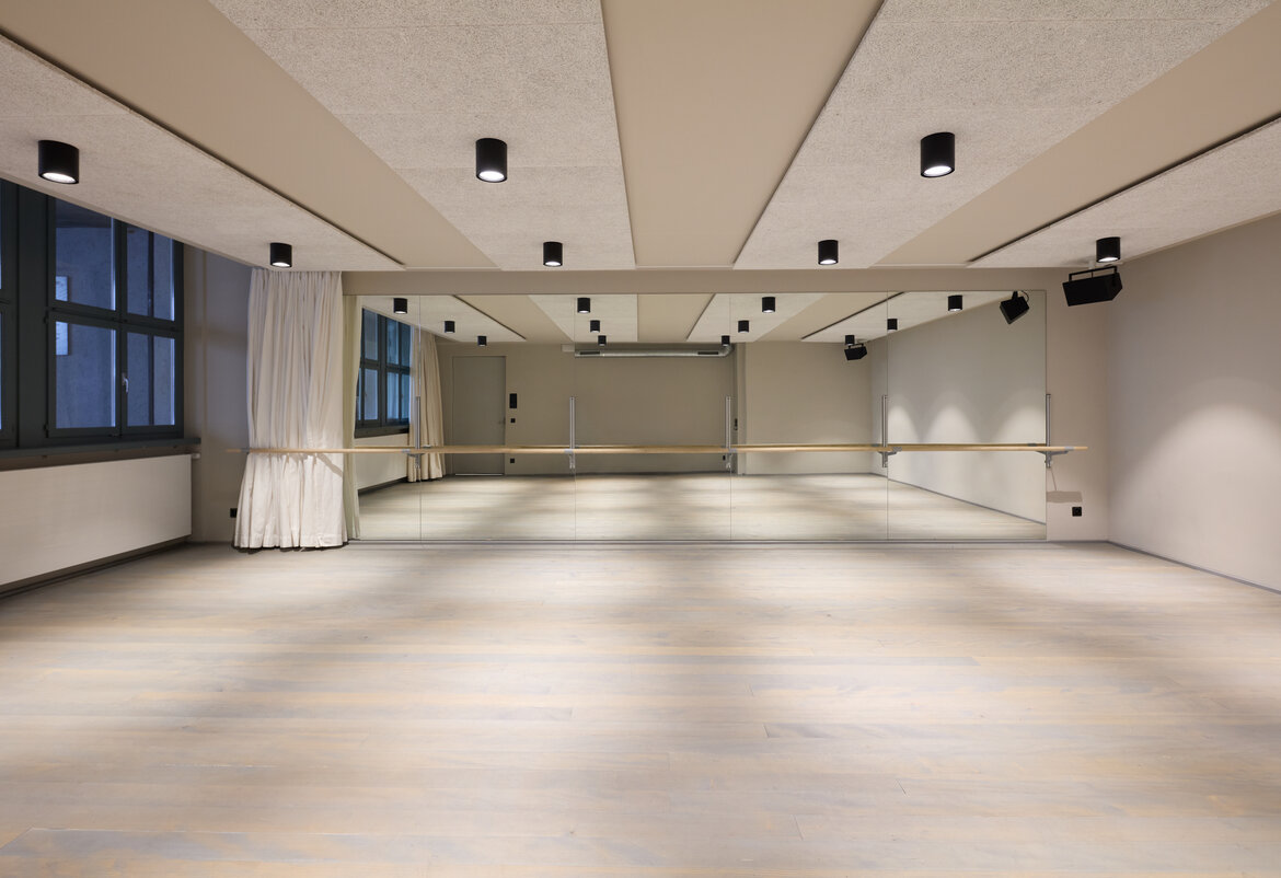 Das Studio 1 ist durch die Ausstattung mit einem Spiegel, Ballettstange und nahegelegenen Garderoben und Duschen für Tanz-Compagnien, sowie für Sport- und Therapie-Aktivitäten hervorragend ausgestattet. Auf Wunsch kann ein Tanzteppich verlegt werden.