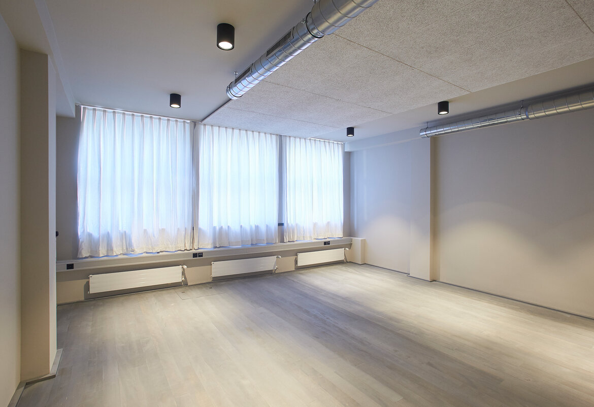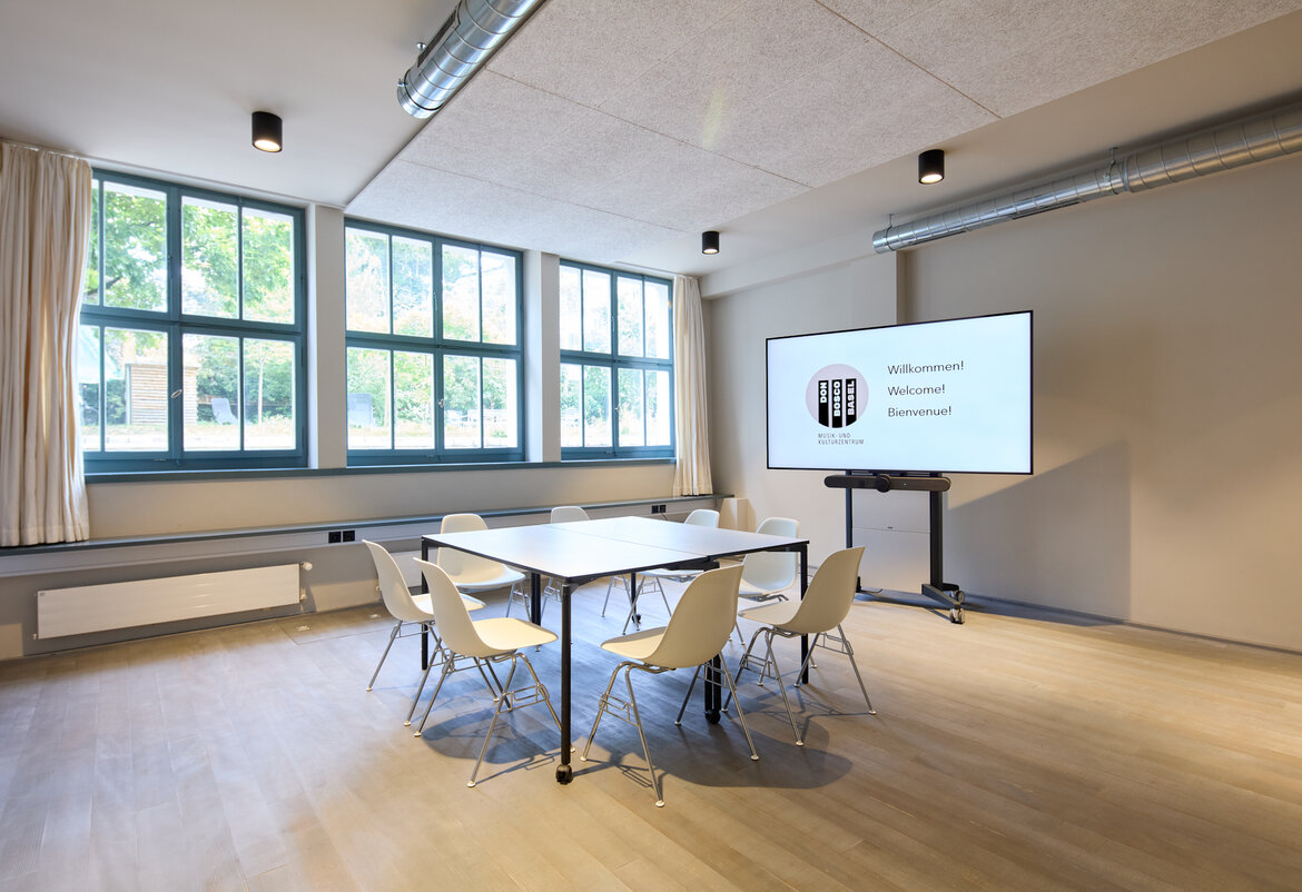 Durch die Ausstattung mit Konferenztischen, Stühlen und einer Leinwand kann das Studio 2 hervorragend für Sitzungen genutzt werden und bietet zudem direkten Blick in den ruhigen Innenhof.